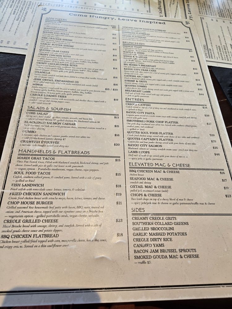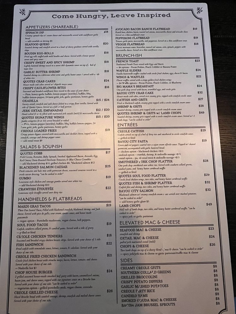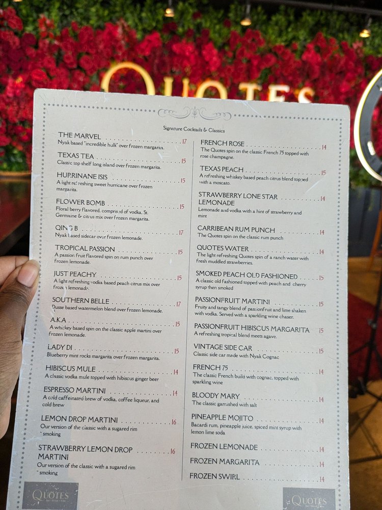 Introducing Quotes Willowbrook, an American restaurant and bar located at 8002 Willowbrook Mall Houston, TX. This trendy and casual spot offers a wide range of amenities including wheelchair accessibility, outdoor seating, free Wi-Fi, and catering services. Customers praise the friendly staff, great atmosphere, and delicious food, with standout dishes like the catfish & shrimp platter, Gouda mac & cheese, and oxtail empanadas. The menu also features unique cocktails like the Smoking Lemon Drop and French Rose drink. The restaurant's cozy yet modern atmosphere, impeccable service, and curated playlist create a memorable dining experience. Whether you're stopping by for brunch or dinner, Quotes Willowbrook promises a warm welcome and outstanding food. I highly recommend trying this restaurant for a delightful dining experience.